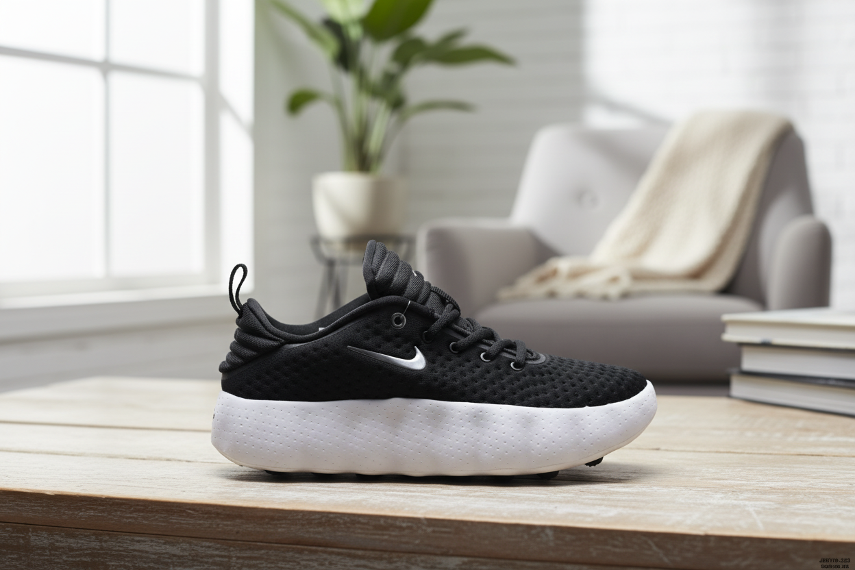 Nike Casual Sport Series black and white breathable sneakers with mesh upper, durable white rubber sole, silver Swoosh logo, unisex design for everyday sports and stylish casual wear.