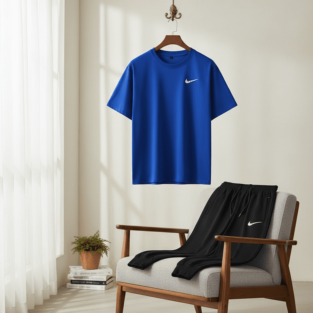 Nike casual sports set features a blue cotton T-shirt and black jogger pants with the classic Swoosh logo. Soft, breathable, unisex design for everyday streetwear comfort and effortless style.