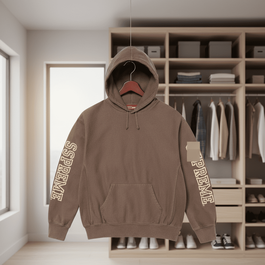 Nike x Supreme Brown Hoodie, cotton fabric for soft breathable comfort, drawstring hood and kangaroo pocket design, Supreme logo on sleeves, unisex streetwear style with both comfort and attitude.