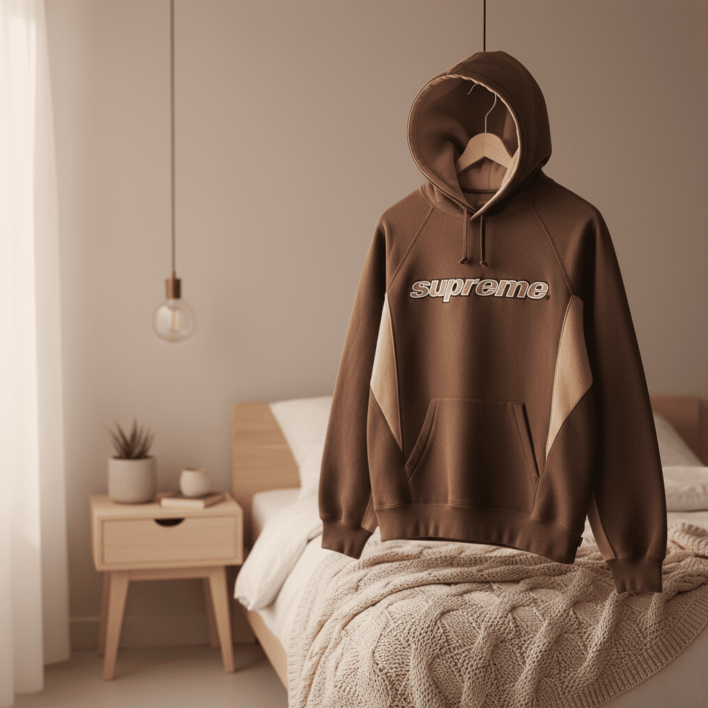 Nike Hoodies: Brown and beige patchwork cotton hoodie, soft and breathable, with adjustable drawstring hood and kangaroo pocket, unisex streetwear style featuring a bold front graphic for trendy comfort.