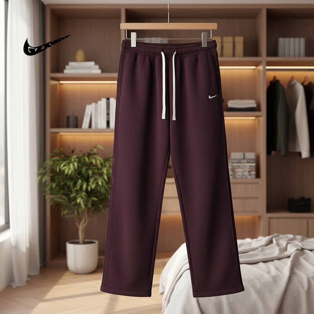 Nike Burgundy Loose Fit Jogger Pants, soft comfortable fabric with side stripe design, white Swoosh logo, adjustable drawstring waist, unisex casual sporty style for daily and light workouts.