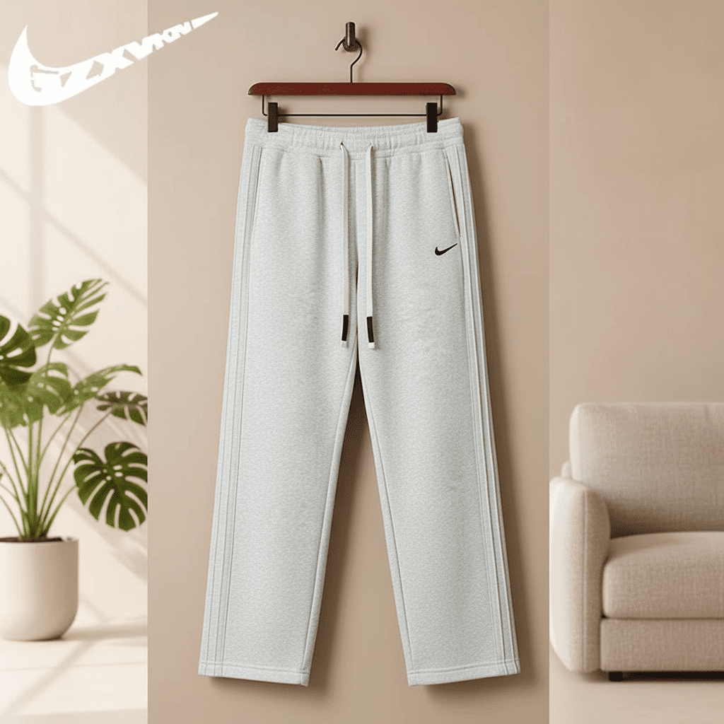 Nike Light Gray Casual Sports Pants – made with premium breathable cotton, featuring a loose wide-leg design, side stripes, drawstring waist, and classic logo for unisex street style everyday wear.