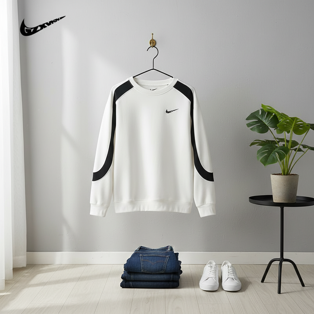 Nike Black and White Patchwork Crewneck Sweatshirt made from premium cotton blend, breathable and comfortable, classic Swoosh logo on chest, unisex casual athletic style, perfect for everyday wear.