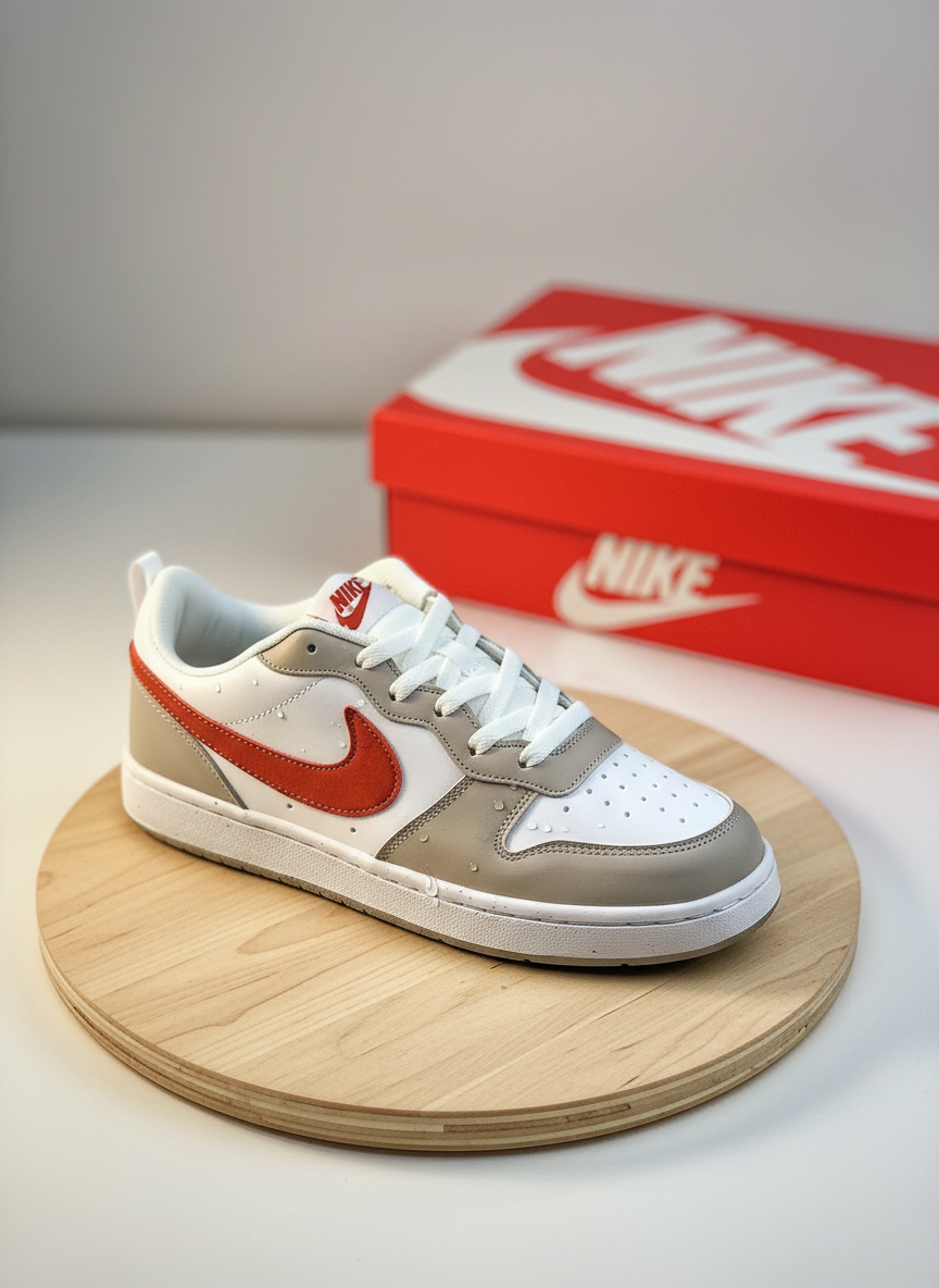Nike Classic Skate Sneakers in gray, white, and red. Leather and suede mix for durability and comfort. Iconic red Swoosh design, streetwear style, perfect for men and women everyday casual wear.