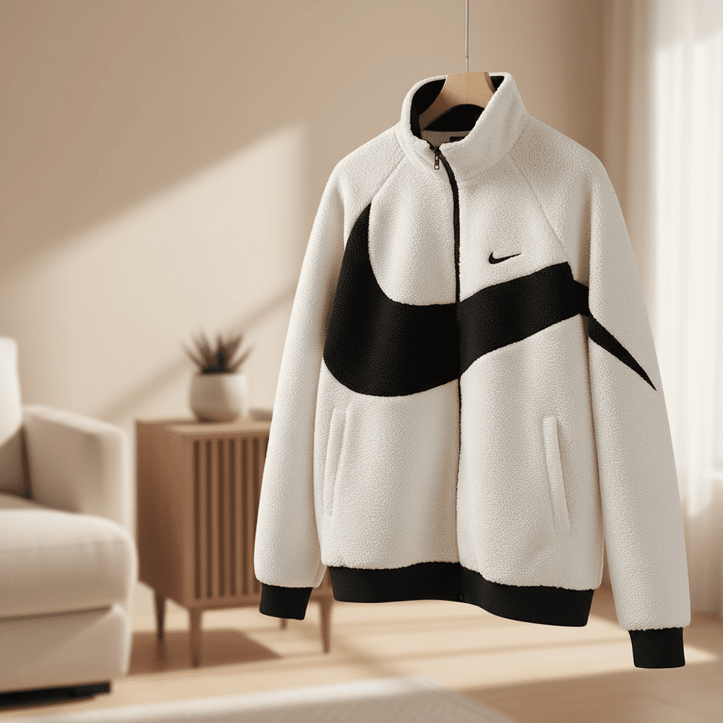 Nike off-white sherpa fleece jacket with stand collar and zip closure, bold black Swoosh design, ribbed cuffs and hem, streetwear style, unisex, soft, warm, and breathable for everyday comfort.