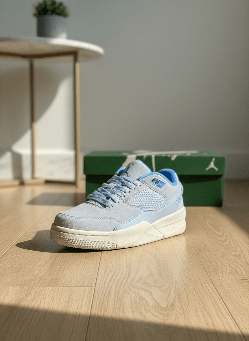 Nike Air Jordan light blue casual sneakers with suede and mesh panels, Jumpman logo, off-white rubber sole, breathable comfort, unisex design, perfect for streetwear and everyday style.