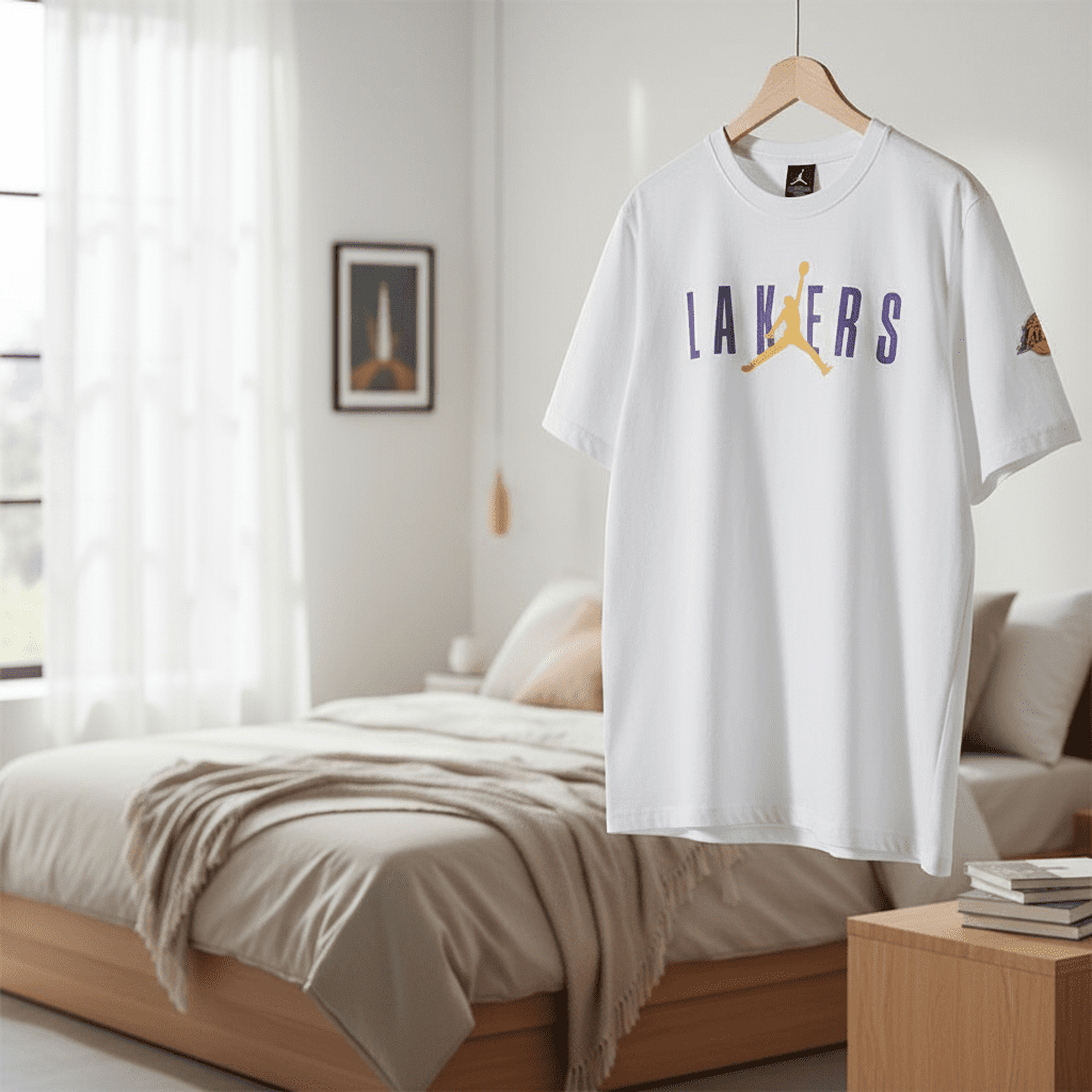 Nike Jordan Lakers White T-Shirt, premium breathable cotton fabric, purple LAKERS lettering with yellow Jumpman logo, team badge on sleeve, unisex sporty casual style, perfect for basketball fans and daily wear.