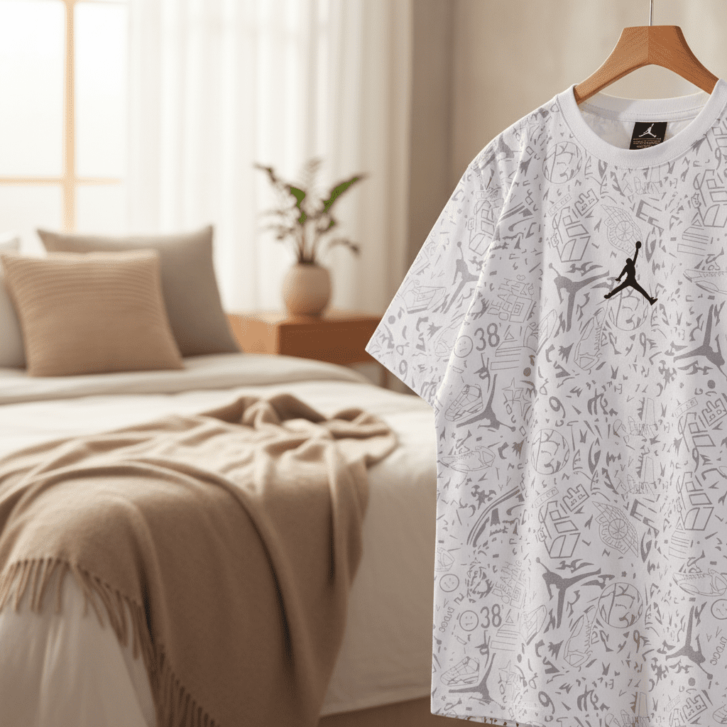 Nike Jordan White Graphic T-Shirt – crafted from soft breathable cotton, features all-over graffiti prints with Jumpman and sneaker motifs. Unisex streetwear style for everyday fashion expression.
