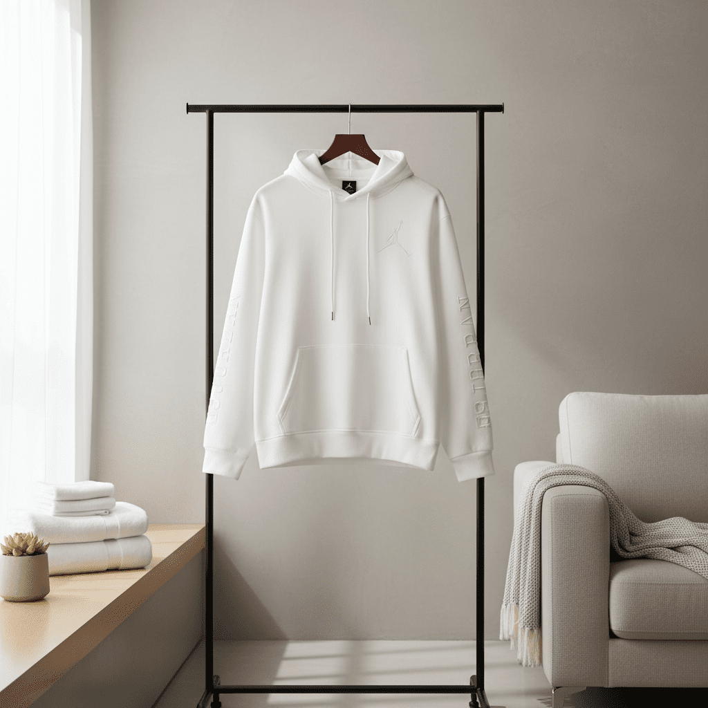 Nike Jordan White Hoodie – soft breathable cotton, drawstring hood, embroidered Jordan logo, sleeve lettering design, kangaroo pocket, unisex streetwear style with ultimate comfort and fashion.