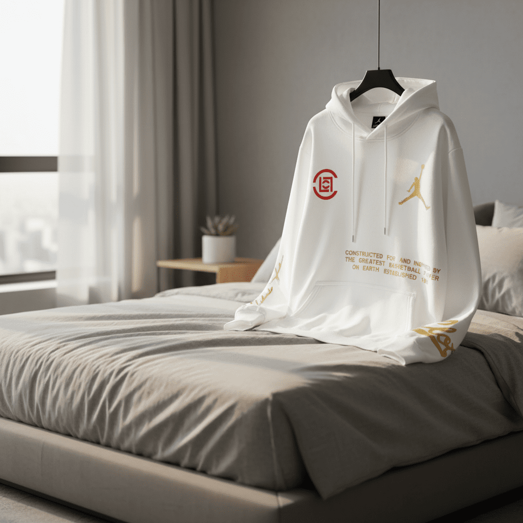 Nike Jordan White Hoodie, premium cotton fabric for comfort and breathability, features gold Jumpman and red circular logo, English print design, unisex streetwear style showcasing sporty fashion personality.