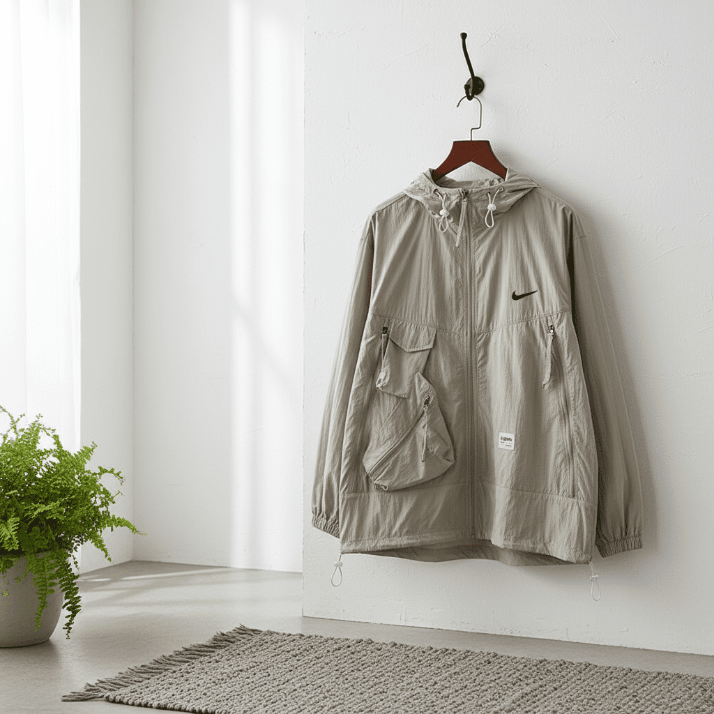 Nike Khaki Lightweight Hooded Windbreaker Jacket featuring nylon fabric, adjustable drawstring hood, multiple utility pockets, chest logo, unisex streetwear style, perfect for daily casual comfort.
