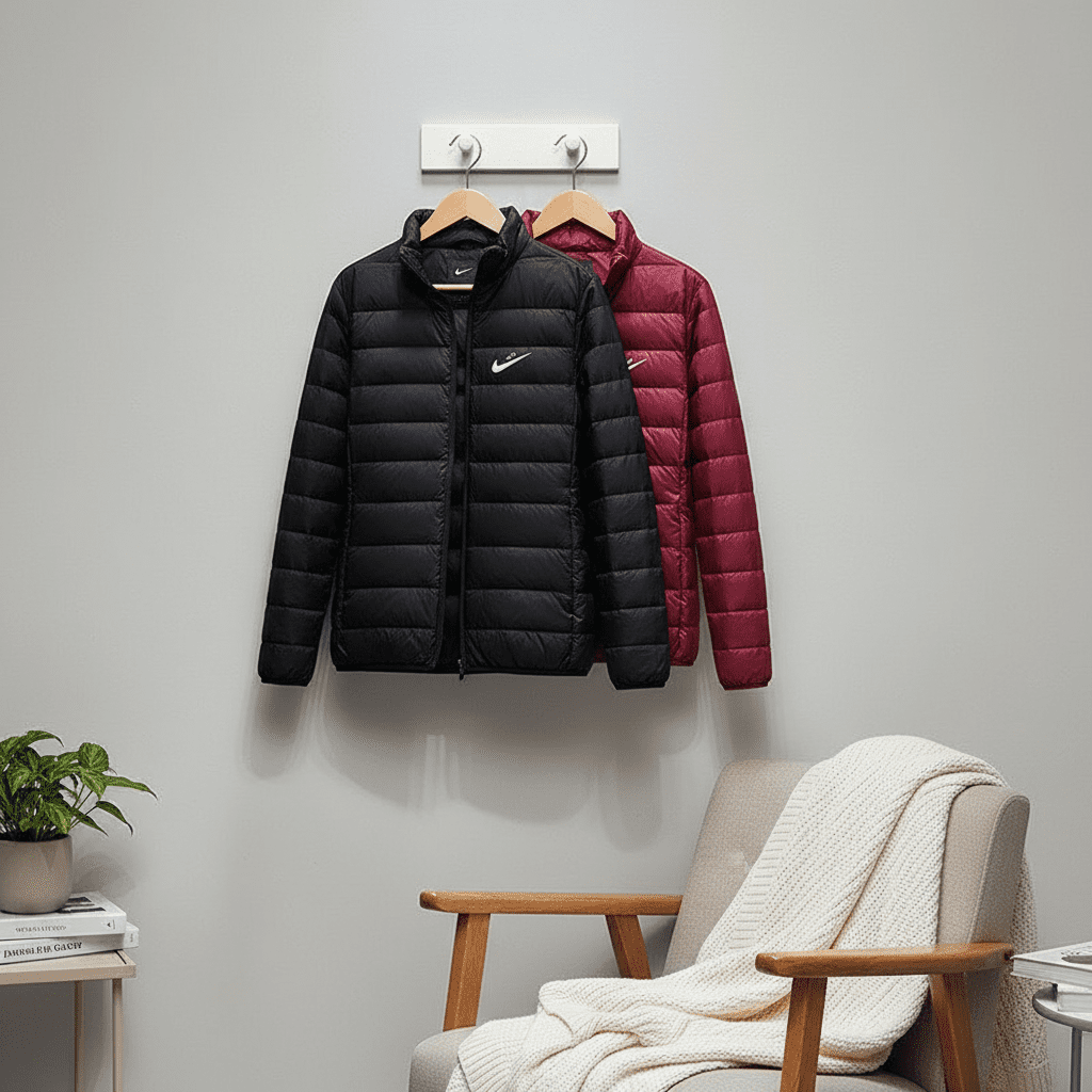 Nike Lightweight Warm Down Jacket for Men and Women, black or wine red, windproof fabric, quilted stand collar, white Swoosh logo, stylish and portable for daily wear and light outdoor activities.