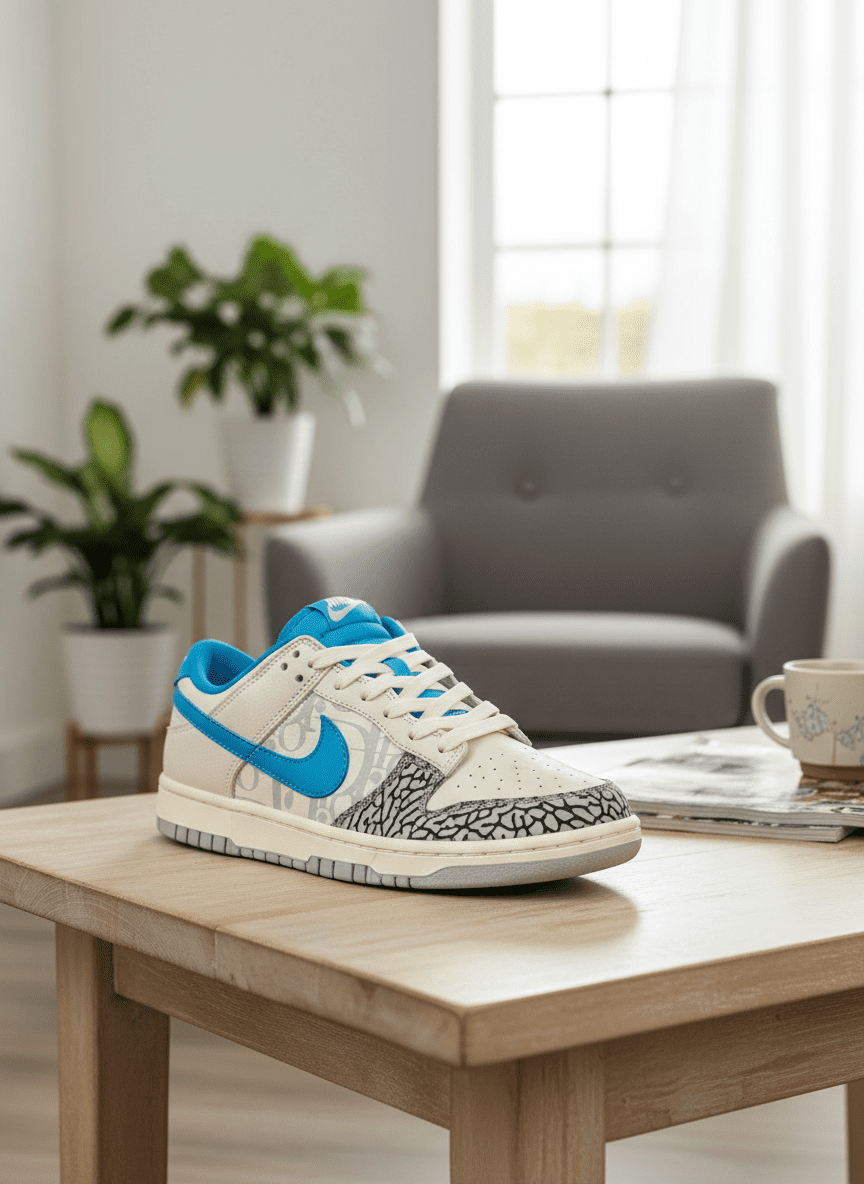 Nike Dunk Low Off-White Blue Snake Pattern Sneakers feature premium leather, black-white snake print, bright blue Swoosh, low-cut comfort fit for men and women, ideal for street fashion and daily wear.
