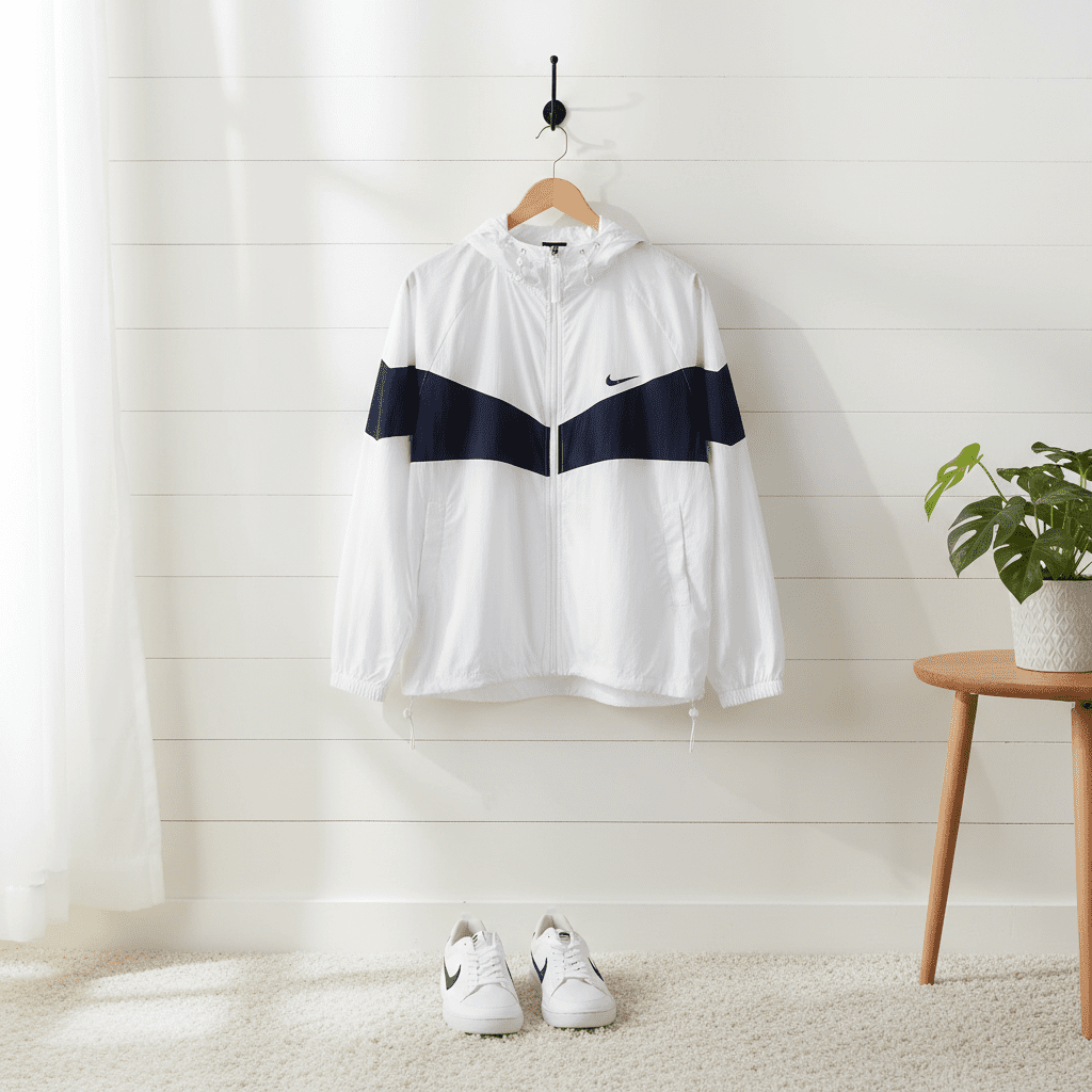 Nike White & Navy Colorblock Sports Jacket, lightweight breathable fabric with sun and wind protection, hooded drawstring design, diagonal stripe patchwork, zip side pockets, unisex street style.