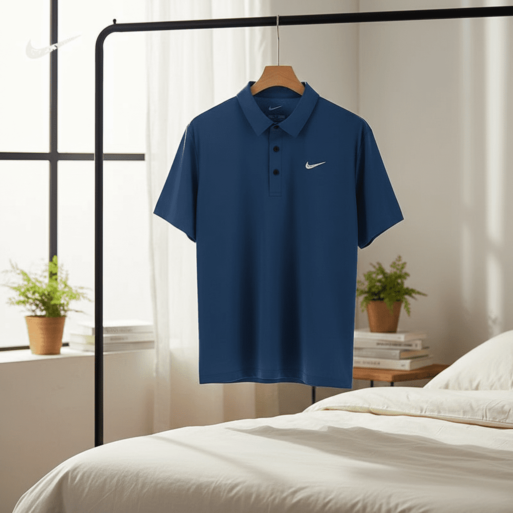 Nike Blue Casual Polo Shirt with breathable fabric, classic collar design, white swoosh logo on chest, simple unisex style perfect for daily wear and light sports.