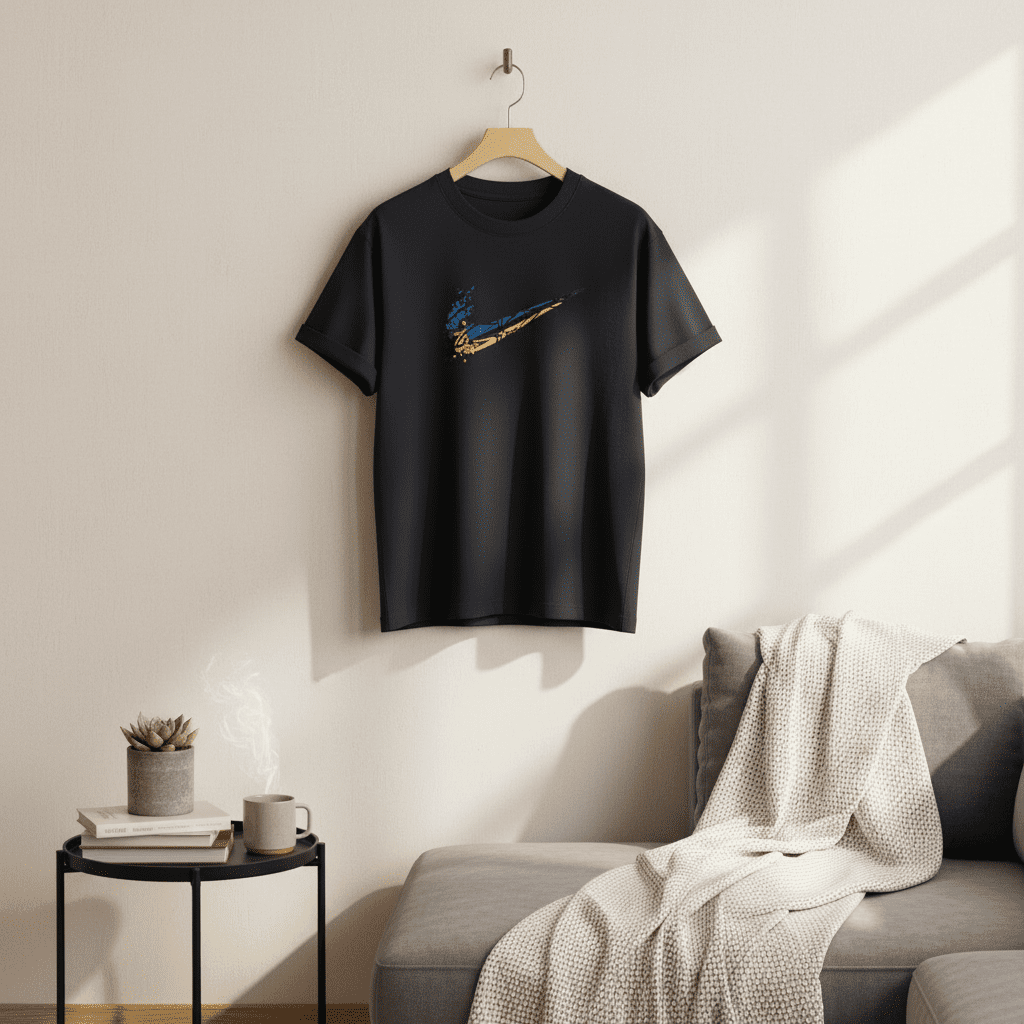 Nike Deep Blue Trendy Cotton T-Shirt, breathable and soft, features a yellow-blue abstract Swoosh print on chest, unisex streetwear style perfect for casual daily outfits and modern fashion.