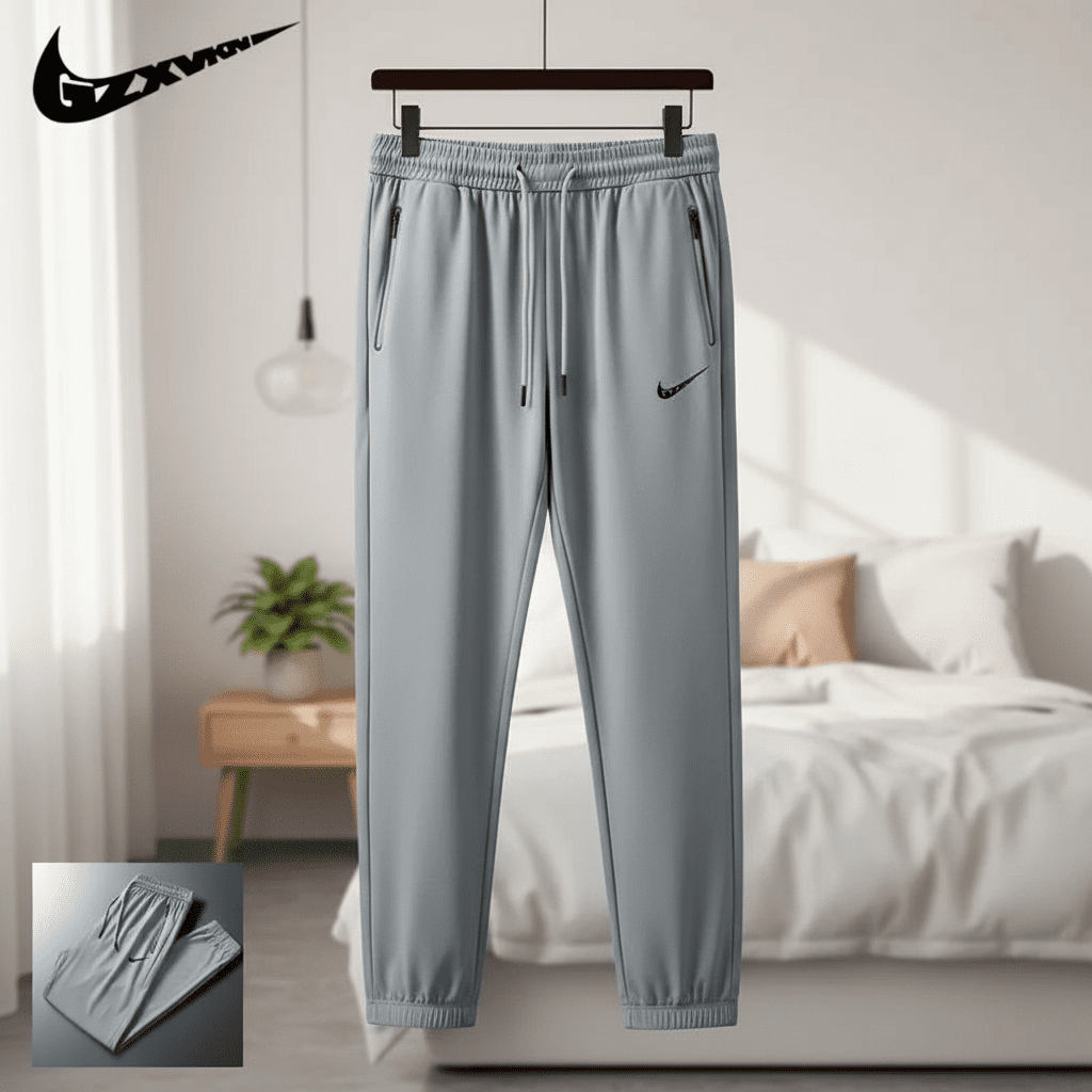 Nike Sports Series light gray breathable quick-dry pants, lightweight fabric with drawstring waist and zip pockets, unisex athletic joggers perfect for workouts, running, or everyday wear.