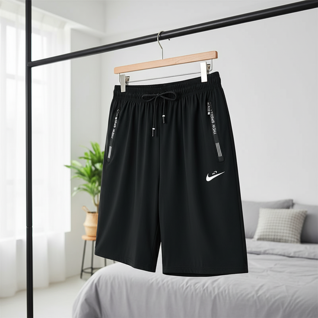 Nike Black Quick-Dry Sports Shorts, lightweight breathable fabric, adjustable drawstring waist, side zip pockets, white Nike logo accent, unisex casual athletic style for daily and workout wear.