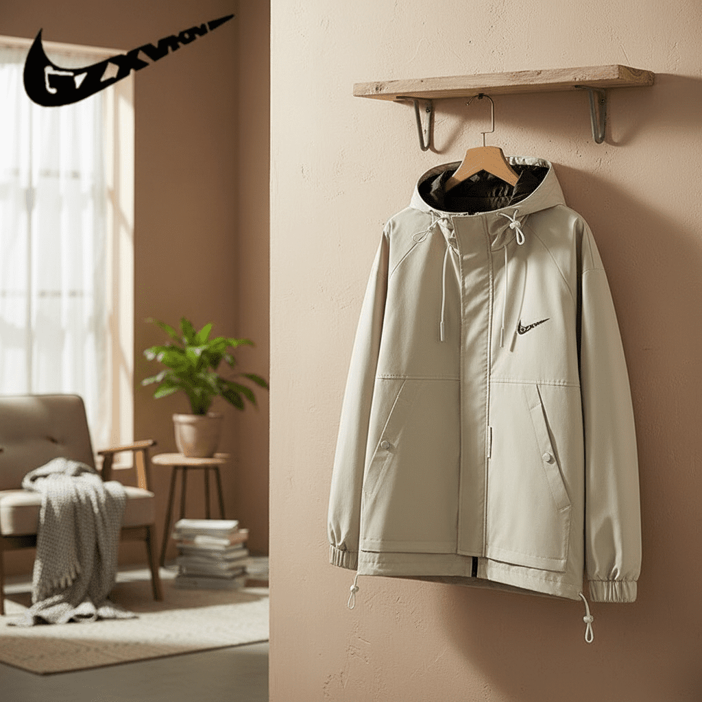 Nike Casual Series Off-White Windbreaker Jacket, made of polyester fabric, hooded with drawstring, classic swoosh logo, dual pockets, unisex streetwear style, comfy for everyday wear.