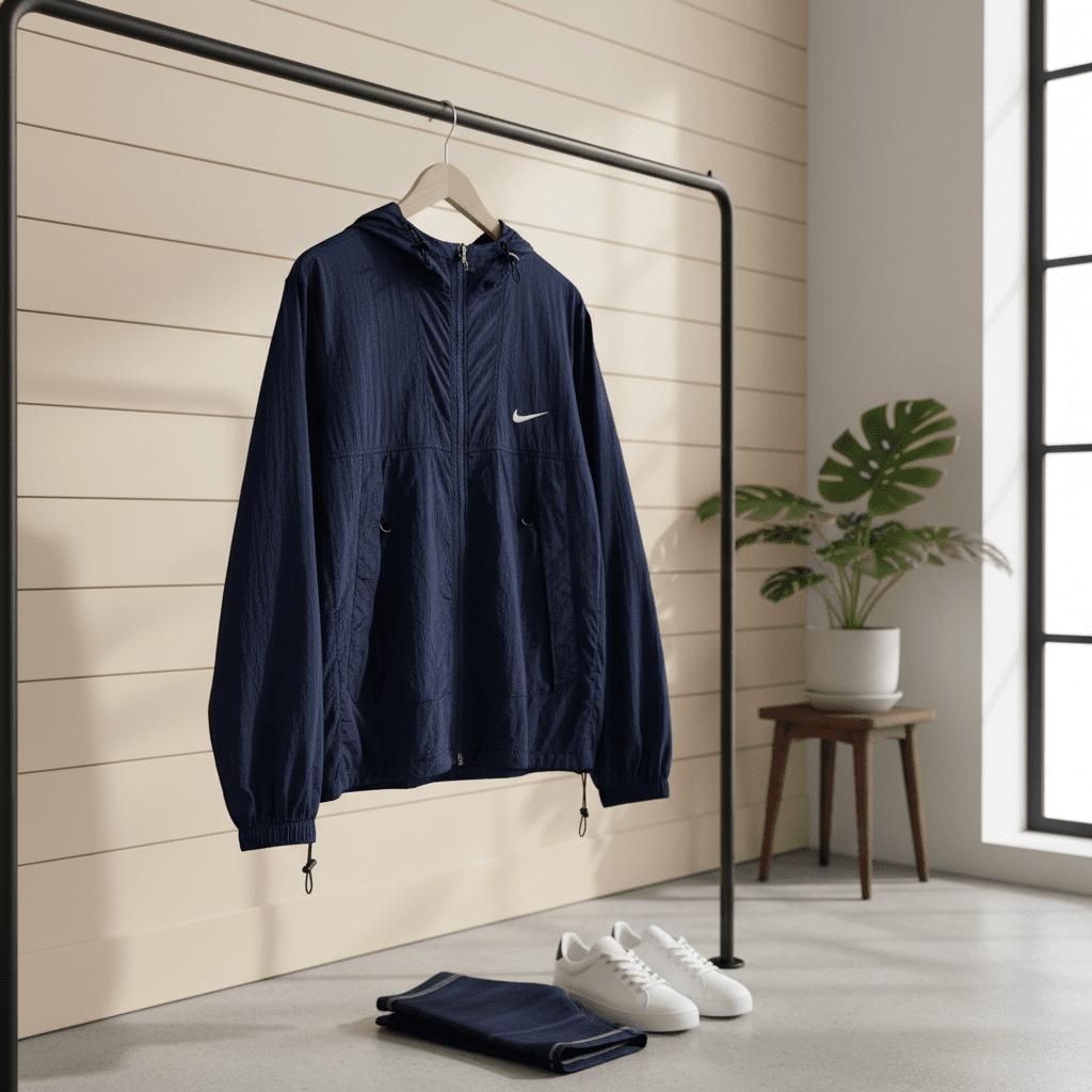 Nike Basic Series Dark Blue Windbreaker – lightweight nylon hooded jacket with drawstring, unisex sporty style, breathable and wind-resistant, classic chest logo, ideal for daily commute or outdoor activities.
