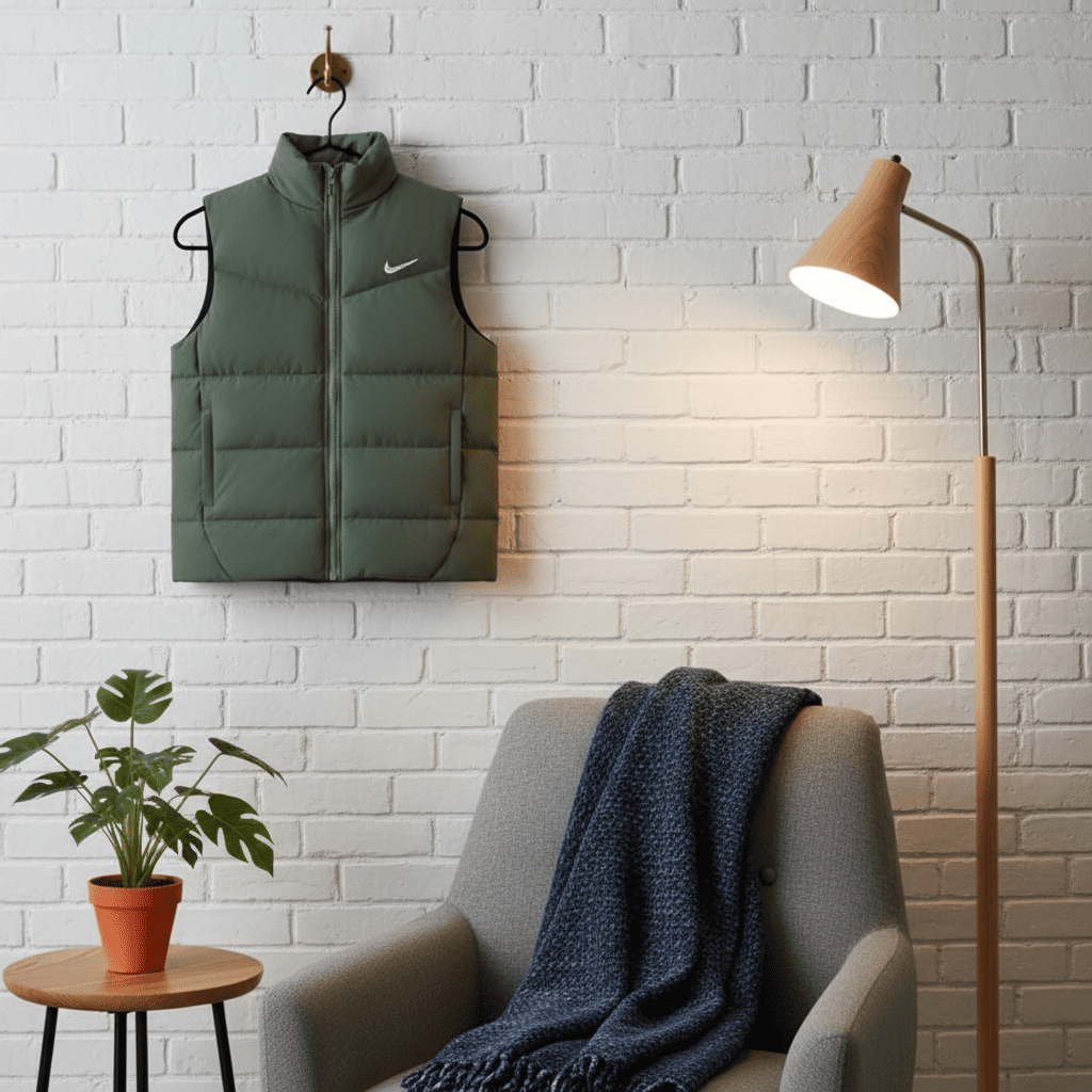 Nike Olive Green Puffer Vest features lightweight padding, stand collar and zip closure, classic white Swoosh logo, unisex sporty casual design for warmth, style, daily wear and light outdoor use.