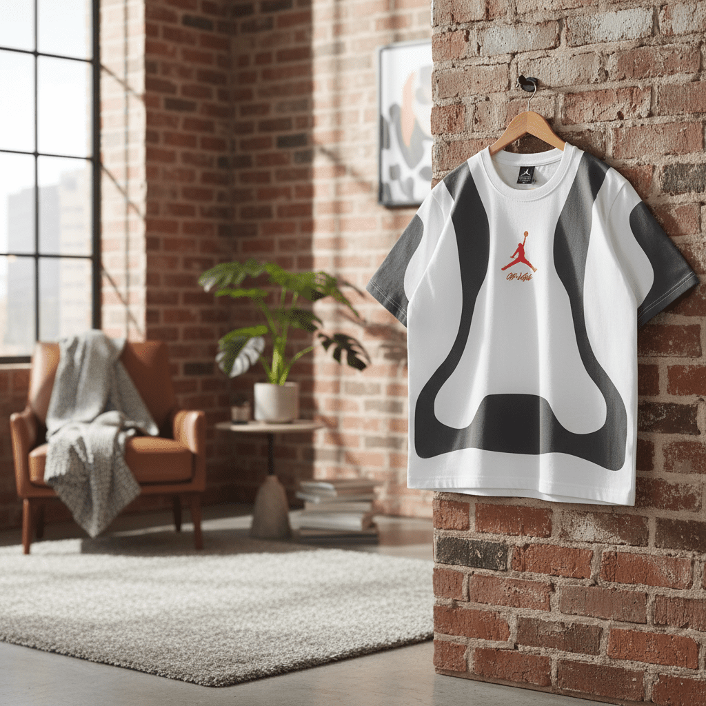 Nike Jordan x Off-White black white gray color-block cotton T-shirt, breathable and soft with red Jumpman logo front and red arrow wings back, unisex streetwear for daily casual style.