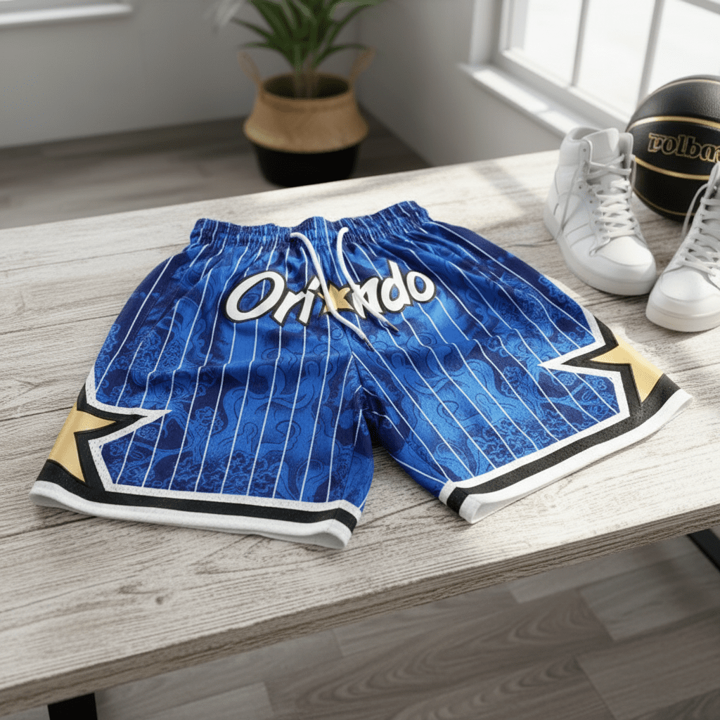 Nike Orlando Magic Blue Basketball Shorts, breathable polyester fabric with white stripes and gold graphics, drawstring waist, street sport style, unisex design perfect for game or casual wear.
