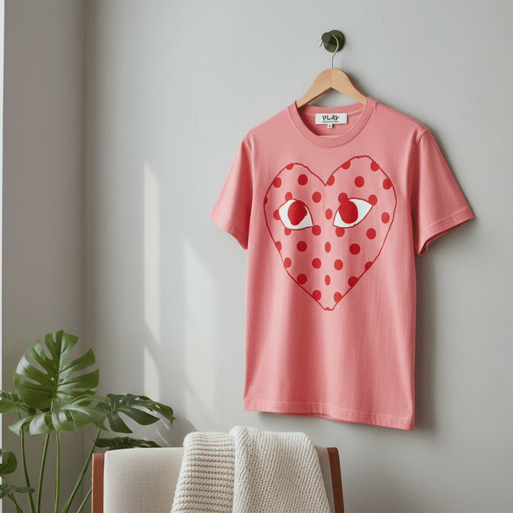 Nike x Comme des Garçons PLAY pink cotton crewneck T-shirt featuring red polka dot heart with eyes graphic, breathable fabric, unisex streetwear style for trendy daily outfits.