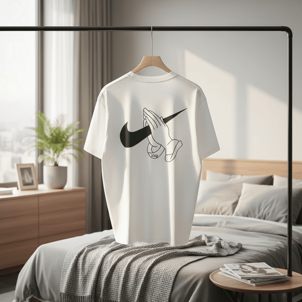 Nike White Street Style Cotton T-Shirt, soft and breathable fabric, featuring green swoosh with praying hands and “aica” design on the back, unisex casual fit for modern fashion lovers.
