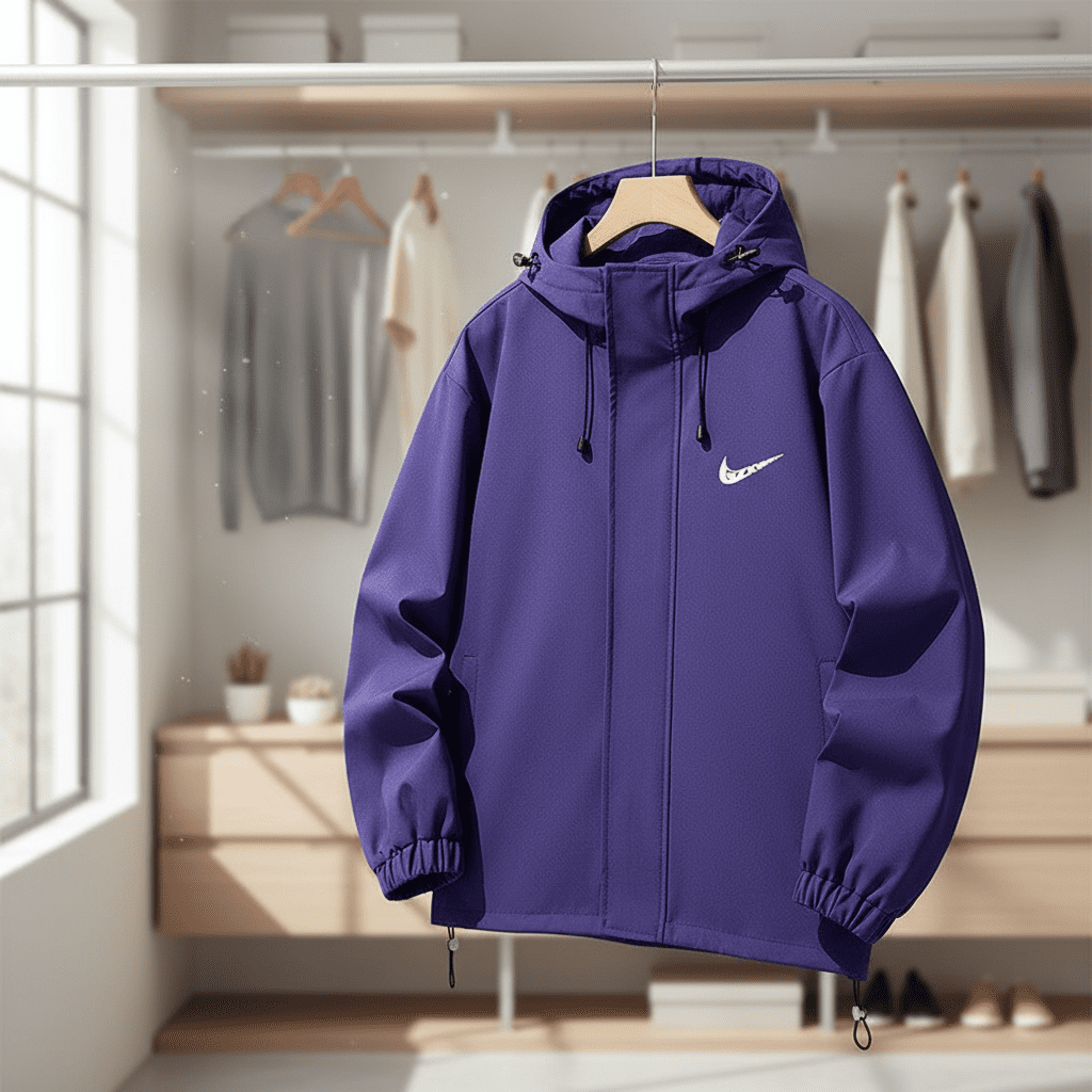 Nike Purple Hooded Jacket, crafted from windproof and wear-resistant fabric, features drawstring hood, elastic cuffs, classic white Swoosh on chest, unisex casual style for street and daily wear.
