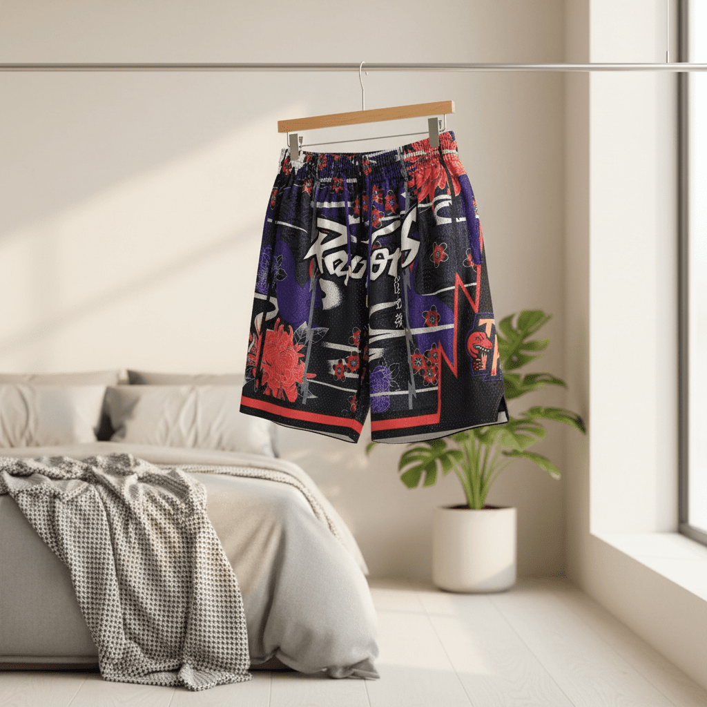 Nike x Raptors Shorts: Purple, black & red color-block mesh design with floral graffiti prints and team logo, drawstring waist, breathable streetwear style for men and women, sporty yet trendy.