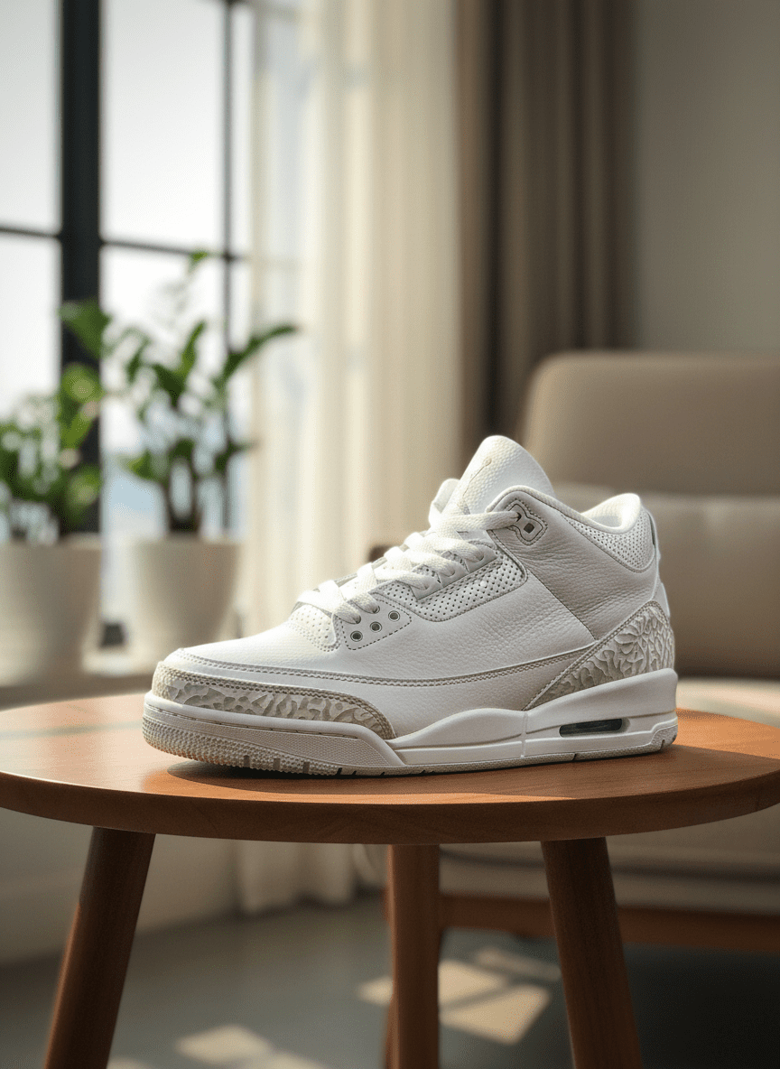 Nike Air Jordan 3 White Sneakers feature premium leather, signature elephant print, breathable design, and timeless street style. Unisex comfort blends sport performance with modern fashion.