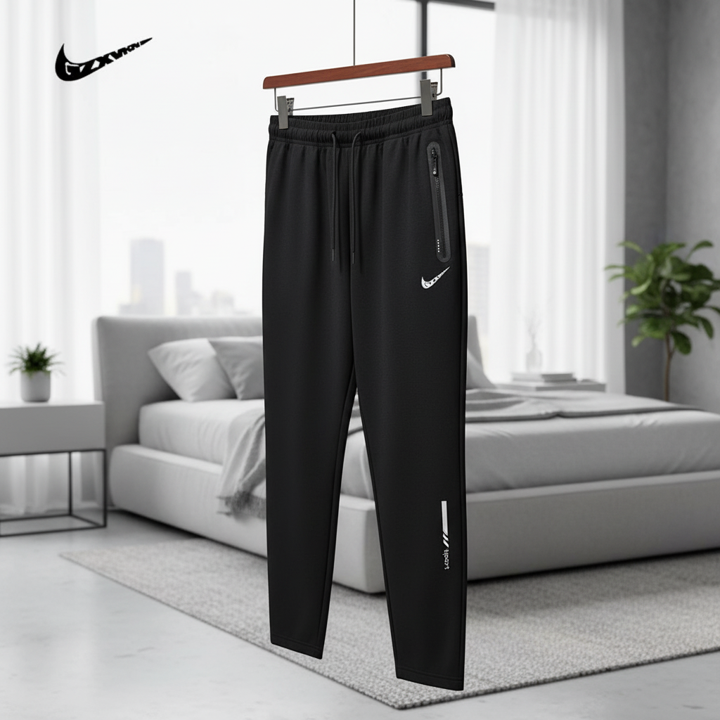 Nike black sports pants made of soft breathable fabric, adjustable drawstring waist, zip side pockets, white Nike logo with “sport” print, unisex design for casual wear and light workouts.
