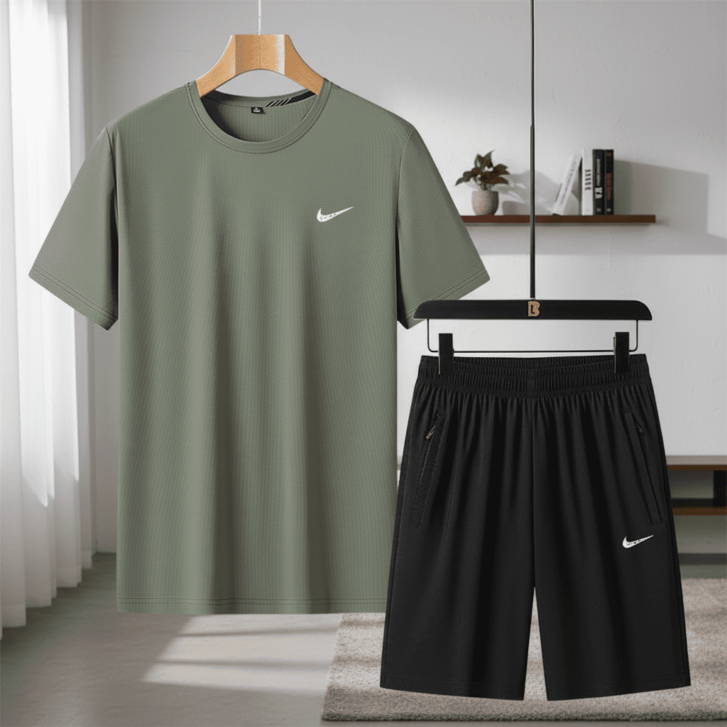 Nike Olive Green T-Shirt and Black Shorts Set, breathable quick-dry fabric, minimalist design with classic swoosh logo, unisex outfit perfect for casual wear and light workouts, stylish comfort.