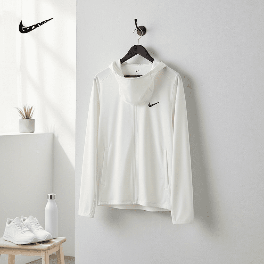 Nike White Lightweight Sun Protection Hoodie – Quick-dry, breathable fabric with full zip and hood, classic logo on chest, unisex sporty casual design for outdoor and everyday comfort and style.