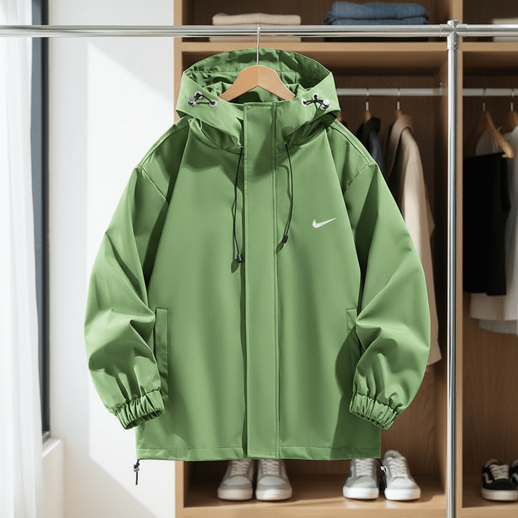 Nike Green Windbreaker Jacket: Waterproof polyester material, adjustable hood with drawstring, elastic cuffs, minimalist swoosh logo, unisex design, ideal for casual and sporty streetwear style.