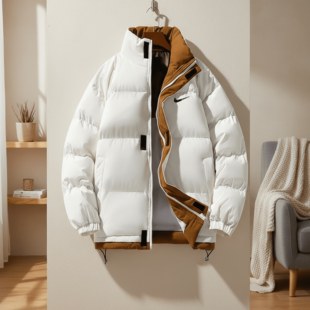 Nike Stand Collar Colorblock Down Jacket – White and Brown design with windproof fabric, down filling, zip and snap closure, ribbed cuffs, drawstring hem, inner classic Swoosh logo, unisex warm trend style.