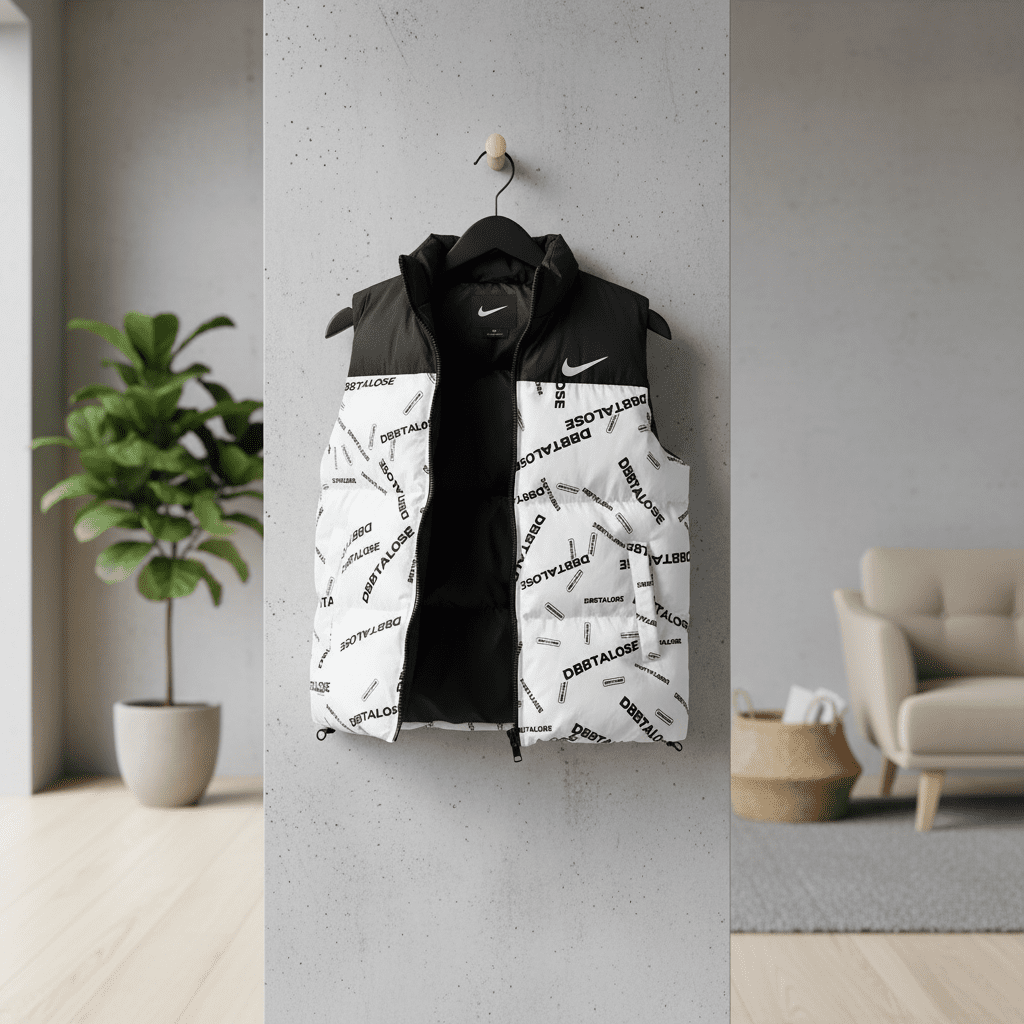 Nike Black and White Colorblock Down Vest, insulated fabric for warmth, stand collar with zip closure, DBBTALOSE print, classic white Swoosh logo on chest, unisex, trendy streetwear style.