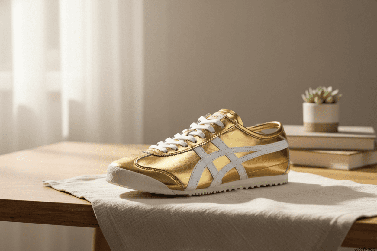 Onitsuka Tiger Classic Gold Sneakers – Metallic finish with signature white tiger stripes, retro sporty style, unisex design, stylish and versatile for everyday comfort and fashion.