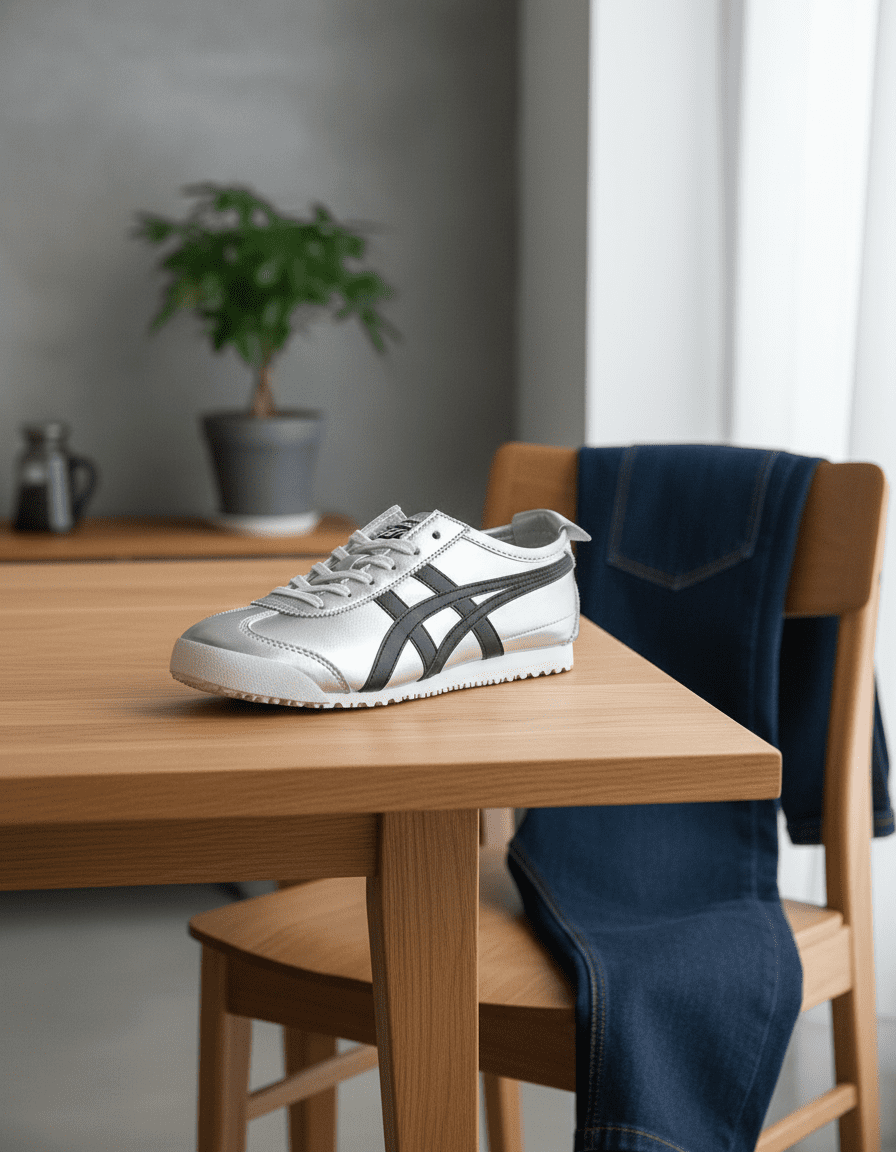 Onitsuka Tiger Mexico 66 Silver Black Sneakers featuring metallic finish and iconic stripes, vintage sporty style for men and women, breathable comfort, timeless design perfect for everyday casual wear.