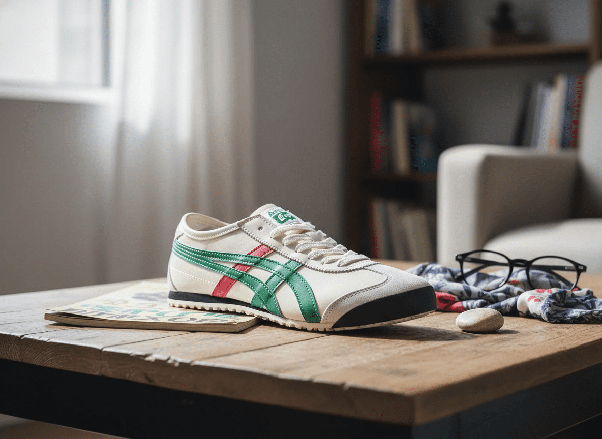 Onitsuka Tiger Mexico 66 sneakers in off-white with green and red stripes, leather and suede upper, vintage athletic style, unisex, durable, comfy, ideal for everyday casual wear.