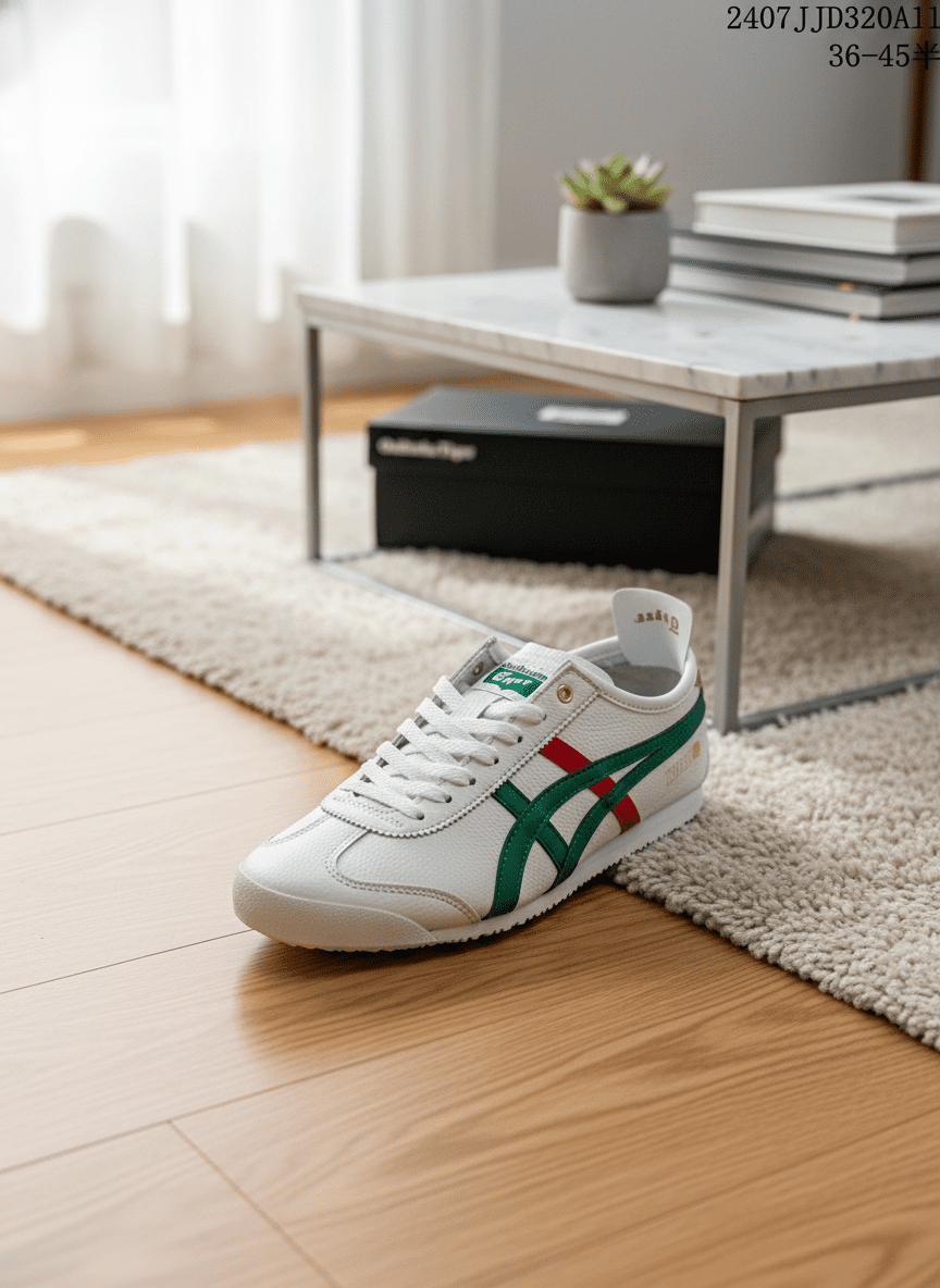 Onitsuka Tiger Mexico 66 White Green Red sneakers feature premium leather, iconic stripe design, retro sporty style, unisex fit, comfortable and durable for casual wear and light activities.