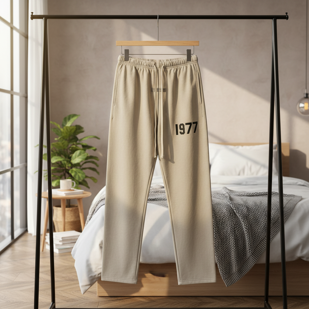 Essentials Pants: Light khaki casual trousers with soft breathable fabric, black “1977” side print, elastic drawstring waist, straight-leg unisex fit, perfect for street style and daily comfort.