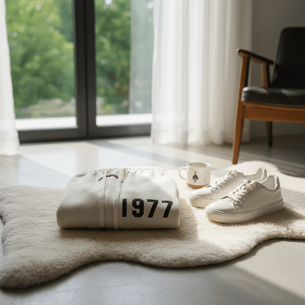 Essentials Pants – Off-white jogger pants crafted from soft cotton, featuring 1977 side design, elastic waistband with drawstring, comfy cuffed fit, unisex streetwear style for daily casual looks.