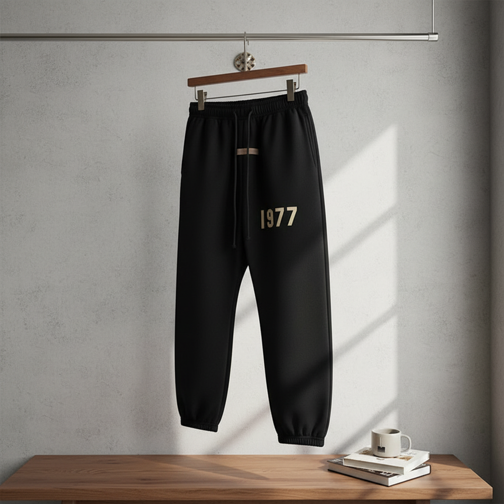 Essentials Black 1977 Print Jogger Pants, made of premium soft cotton, feature gold 1977 logo, adjustable drawstring waist, tapered cuffs, unisex design, and trendy streetwear style.