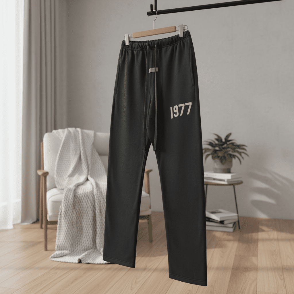 Essentials Black Casual Pants feature soft comfy fabric, 1977 side graphic, drawstring waist, unisex design, perfect for streetwear style and everyday comfort with trend-forward appeal.