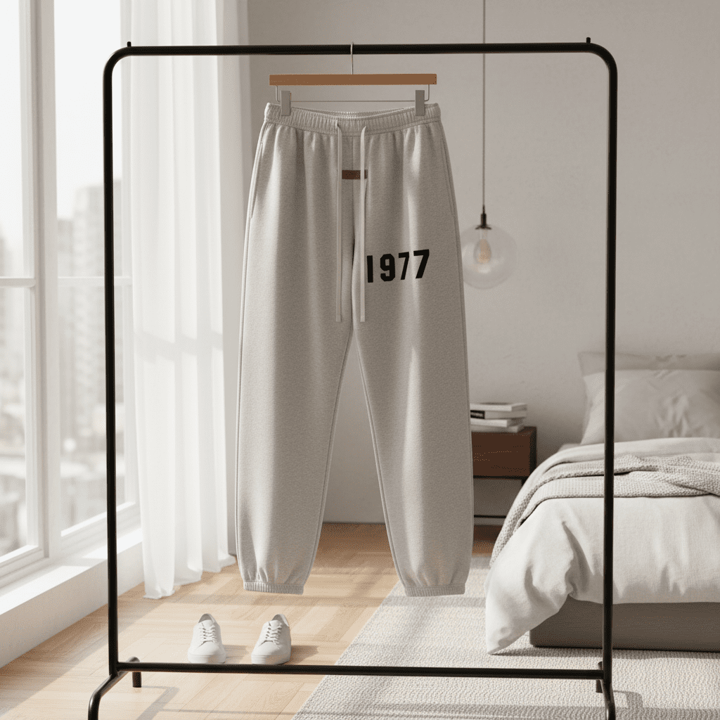Essentials light grey 1977 sweatpants crafted from premium cotton, soft and comfy with drawstring waist and cuffed hems, unisex streetwear style perfect for daily casual fashion.