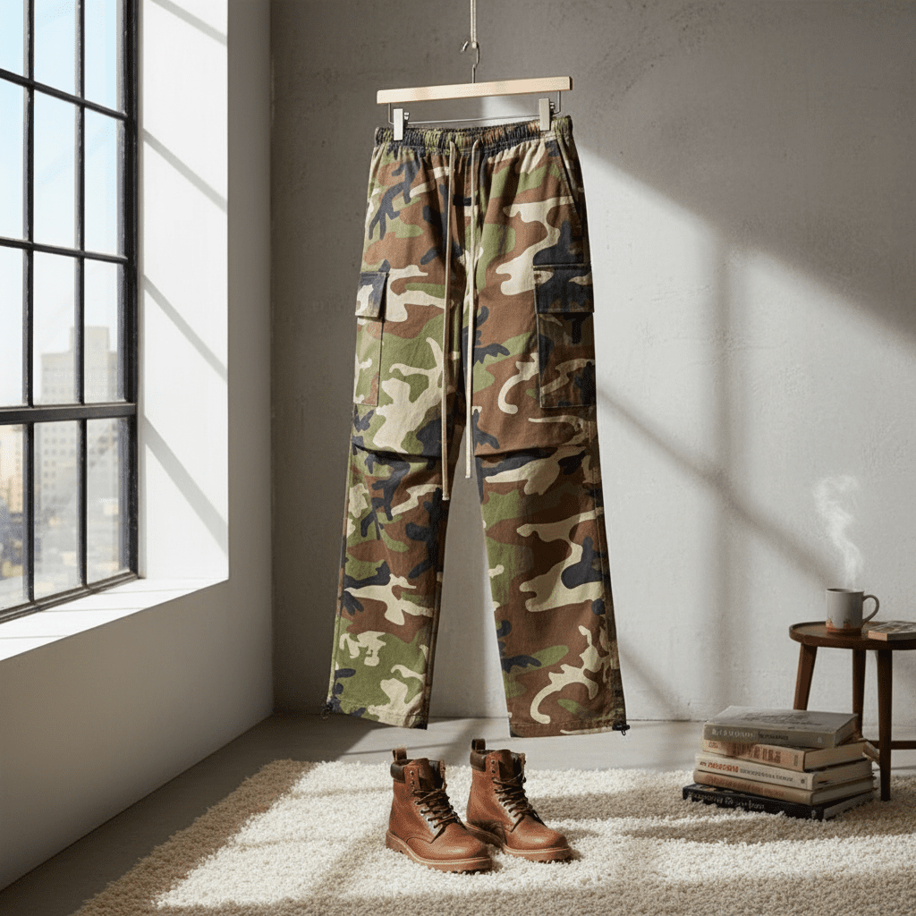 PantsEssentials Essentials Camo Cargo Pants: premium cotton blend fabric, adjustable drawstring waist, multi-pocket utility design, tapered cuffs, unisex street style for daily casual wear.