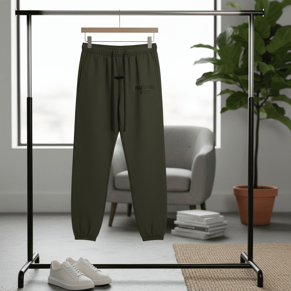 PantsEssentials Olive Green Joggers – soft cotton comfort, elastic drawstring waist, side logo print, tapered cuff design, unisex fit, perfect for streetwear style and daily casual wear.