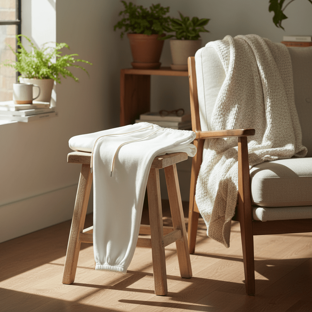 Essentials White Jogger Pants feature premium soft breathable cotton, elastic waistband with drawstring for comfort, sleek cuffed design for men and women, perfect for daily street casual style.